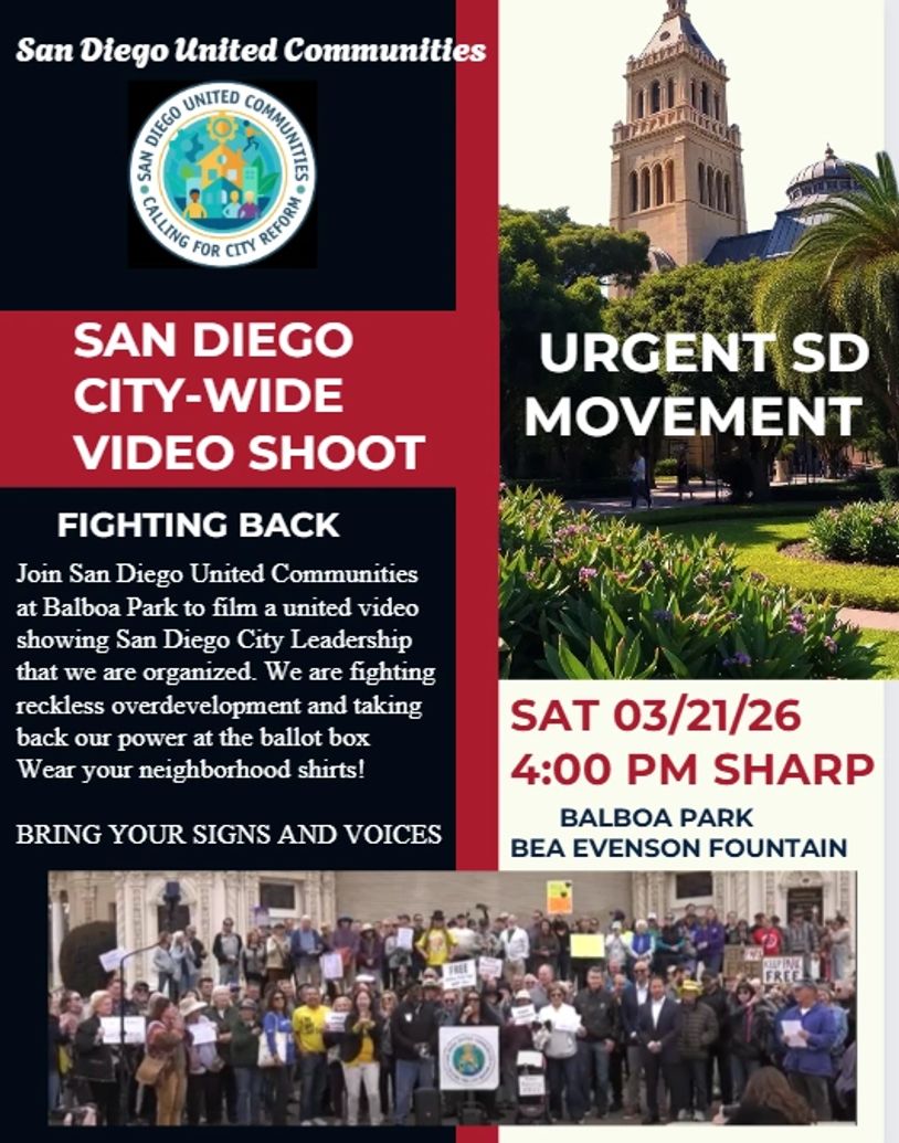 URGENT: We’re fighting back. Join the city-wide video shoot at Balboa Park on 3/21!Neighbors and San Diego United Communities Supporters,San Diego is being destroyed by reckless overdevelopment, and it’s time to show Mayor Todd Gloria and the City Council that we are watching, we are organized, and we are ready to fight back.